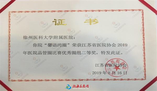 8月16日,江苏省医院协会2019年医院品管圈比赛在南京举行。徐医附院护理部选送的甲乳外科“馨语湾圈”荣获“二等奖”。本次馨语湾圈的主题是:“提高乳腺癌术后患者患肢功能早期功能锻炼规范执行率”。