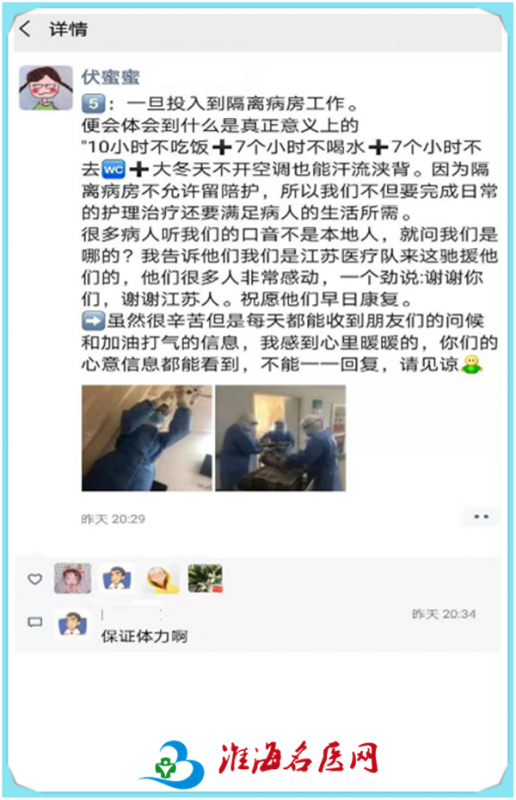 “当听说江苏省支援武汉募集人员后,我毫不犹豫的就报了名,没有和父母商量,但父母知道后,非常支持我,这给了我莫大勇气和力量。这也是我作为一名医务工作者,一名党员,救死扶伤是我义不容辞的责任和决心!”