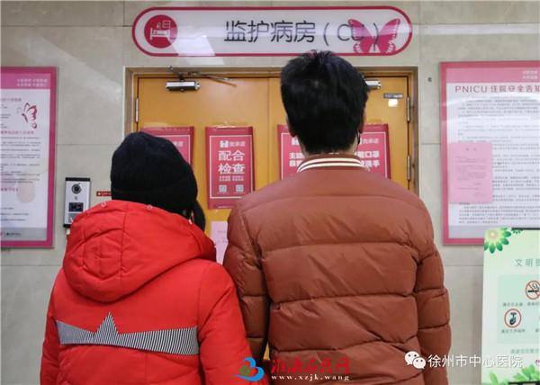 在徐州市中心医院儿科监护室门口,四胞胎父母紧紧偎着,一起等候三个宝宝出来