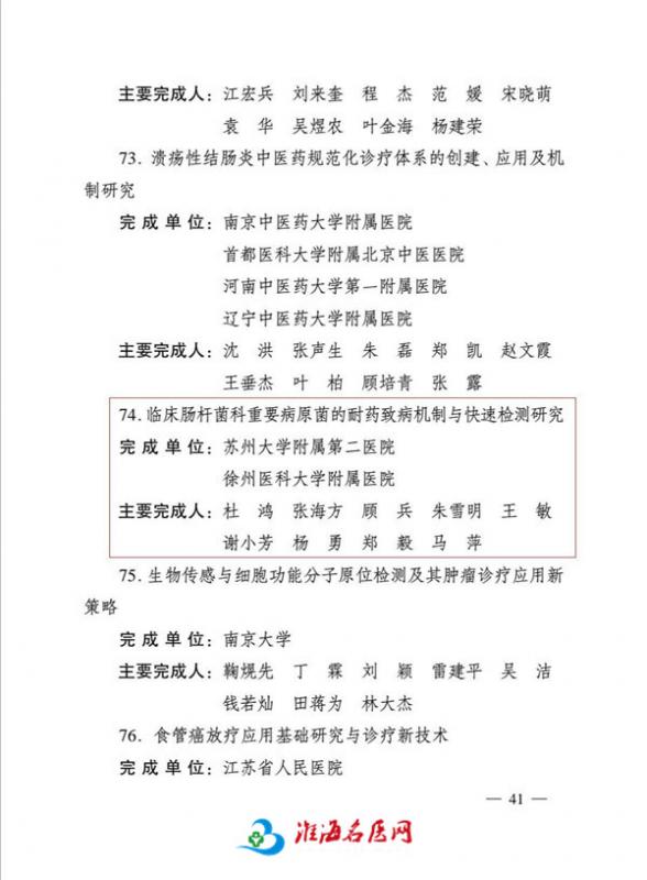 日前,江苏省人民政府发布《省政府关于2019年度江苏省科学技术奖励的决定》,徐医附院郑骏年教授团队项目“肿瘤分子靶点筛选及其抗肿瘤作用研究”荣获2019年度江苏省科学技术奖一等奖,顾兵教授团队参与的项目“临床肠杆菌科重要病原菌的耐药致病机制与快速检测研究”荣获2019年度江苏省科学技术奖二等奖,徐医附院为该研究项目的第二单位。
