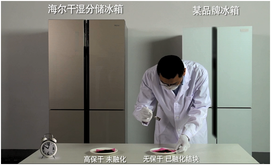 那么咖啡粉放在冰箱里到底是否合适?随着主持人的镜头走进了实验室,同一份咖啡粉被分成两份,一份放进海尔干湿分储冰箱的保鲜干区,一份放在没有干湿分储冰箱的保鲜区。经过24小时的存放,实验人员同时取出两份咖啡粉。保鲜干区里存放的咖啡粉没有什么变化还是粉末状,而在普通保鲜区里存放的咖啡粉已经受潮发生粘连,黏在勺子上。