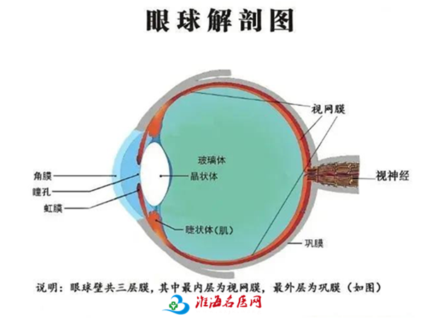 眼球壁共分为三层:从外到内依次为第一层角膜,巩膜;第二层虹膜,睫状体,脉络膜;第三层视网膜。光线通过角膜,房水,晶状体,玻璃体,到达视网膜。看远看近是睫状体对晶体作用的结果。