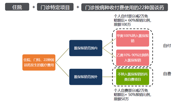 因疾病或意外发生的、门诊按病种收付费使用的22种国家谈判药品费用,经徐州医保报销后,医保支付限额内的自付费用。
