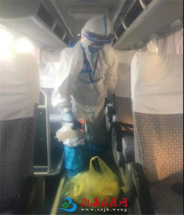 在转运途中,一名女孩因路途颠簸,身体抱恙发生呕吐,共产党员马丽伟立即赶到其身边给予帮助,并迅速对呕吐物进行消杀封闭。随后为其更换口罩,递上矿泉水漱口,并妥善安置,细心照顾。