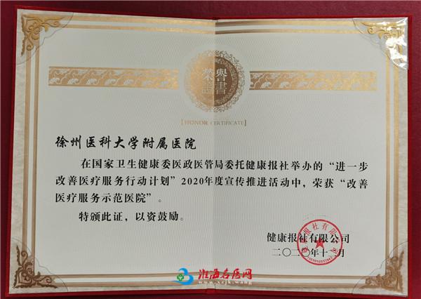 在国家卫生健康委医政医管局委托健康报社举办的2020年度“进一步改善医疗服务行动计划”活动中,徐医附院荣获“改善医疗服务创新医院”,常务副院长金培生教授、放疗科主任章龙珍教授获评“改善医疗服务突出贡献工作者”,麻醉科、普通外科荣获“改善医疗服务示范科室”。