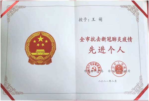 2021年2月20日在徐州市高质量发展暨抗击新冠肺炎疫情疫情总结表彰大会上,医院荣获组织“抗击新冠肺炎疫情先进集体”称号,副院长王萌荣获“抗击新冠肺炎疫情先进个人”称号。