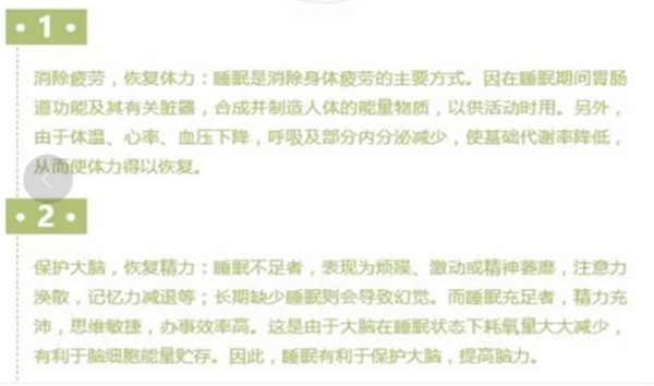 睡眠是人体的一种主动过程,可以恢复精神和解除疲劳。充足的睡眠、均衡的饮食和适当的运动,是国际社会公认的三项健康标准。为唤起全民对睡眠重要性的认识,2001年,国际精神卫生和神经科学基金会主办的全球睡眠和健康计划发起了一项全球性的活动,此项活动的重点在于引起人们对睡眠重要性和睡眠质量的关注。