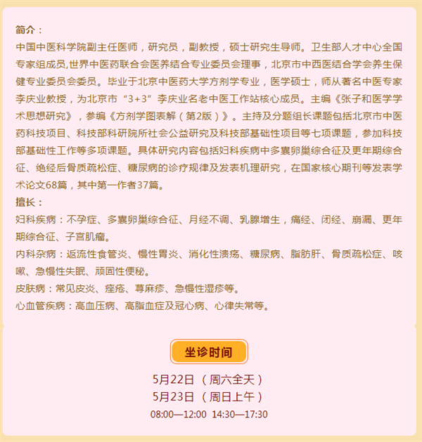 坐诊时间:5月18日 (周二上午)08:00—12:00
