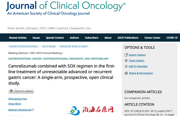 在2021年美国临床肿瘤学会年会(ASCO)上,徐州医科大学附属医院肿瘤科副主任韩正祥教授医疗团队牵头的一项临床研究——“卡瑞利珠单抗联合SOX方案一线治疗不可切除的晚期或复发性胃癌的单臂、前瞻性、开放性临床研究”荣登大会报告。
