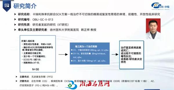 该项研究是徐州医科大学附属医院的韩正祥教授牵头的该项研究是一项单臂、前瞻性的临床研究,患者人群为初治不可切除的晚期或复发性HER2阴性胃/胃食管结合部腺癌,所有患者均接受卡瑞利珠单抗联合SOX方案治疗,每3周为1个治疗周期,治疗直至疾病进展、死亡或者出现不可耐受毒性。该研究主要研究终点为PFS,次要研究终点为OS、ORR、DCR和安全性等。