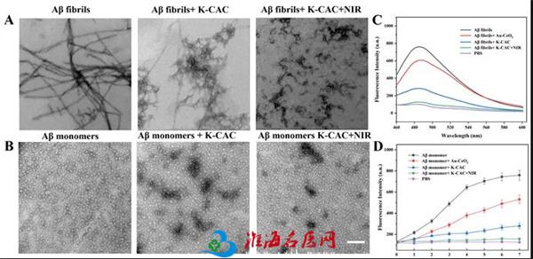 Aβ单体聚集成纤维丝并在神经元外聚积,干扰突触功能,其寡聚体形式具有很强的细胞毒性。为了证实K-CAC对Aβ的抑制作用,通过透射电子显微镜研究了K-CAC对 Aβ聚集过程的影响。结果表明,NIR激光处理条件下,K-CAC对Aβ单体的聚集过程具有明显的抑制,并对Aβ预制纤维具有破坏作用。
