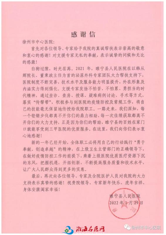 睢宁县人民医院送来感谢信