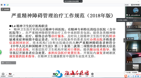 为了提高全市精防人员严重精神障碍管理服务技术水平,提升严重精神障碍管理治疗服务工作质量,市精神卫生中心于2022年2月25日采用线上培训形式,对各县(市)、区项目办业务管理员、精神卫生医疗机构及基层卫生医疗机构300余名精防人员开展严重精神障碍管理治疗技术、法律法规及工作职责等相关业务知识培训。徐州市卫健委副主任常桂秋、市精神卫生中心党委书记张伟、副主任朱相华出席此次培训会议。
