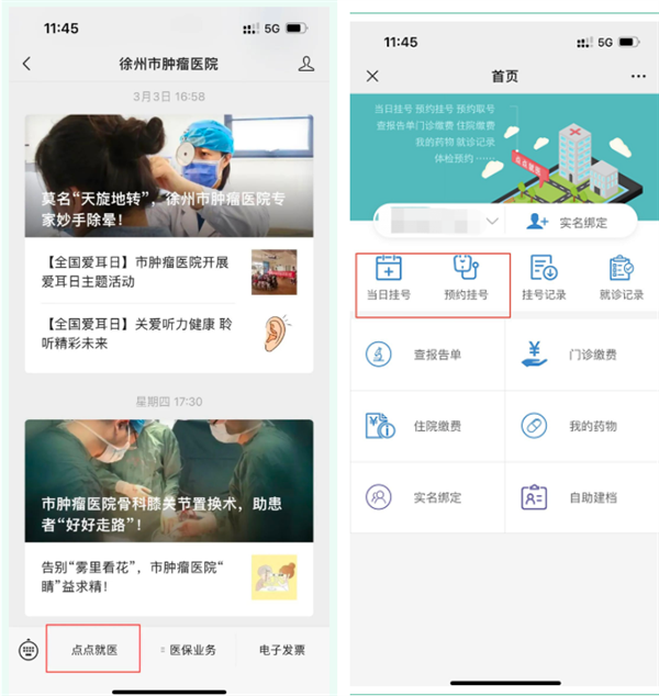 关注“徐州市肿瘤医院”微信公众号,点击“点点就医”“当日挂号”“核酸检测门诊”完善个人信息后挂号缴费