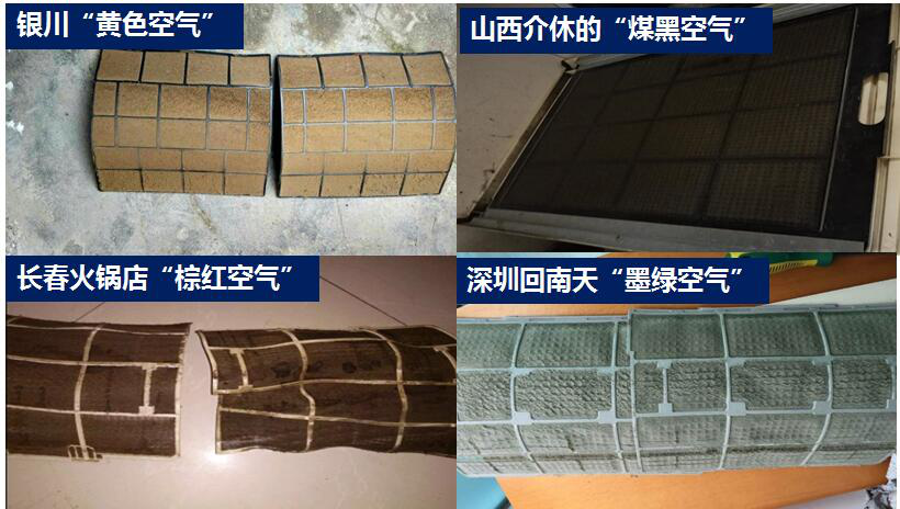 其他部分地区由于空调使用的环境特殊,形成了比较小众的墨绿色、红棕色、黄色和黑色四种家庭室内“空气颜色”。例如,在气候湿热的南方及沿海地区,空调灰尘易发霉呈现墨绿色;在火锅店、川菜馆等油烟大的地方,空调灰尘呈红棕色;在风沙大的西北部地区及靠近发电厂、大型货运中转地带等区域,空调灰呈与沙粒一样的黄色;在绿化较差的煤炭矿区周围,工业污染让空调过滤网和换热器上吸入黑色的灰尘。