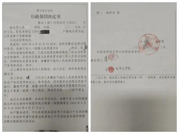 4月21日21时许,睢宁县公安局城西派出所民警在巡逻过程中发现,八一西路大自然菜市场北门内侧肉店,朱某某在明知疫情封控期间门店不可营业的情况下,私自对外营业出售猪肉。