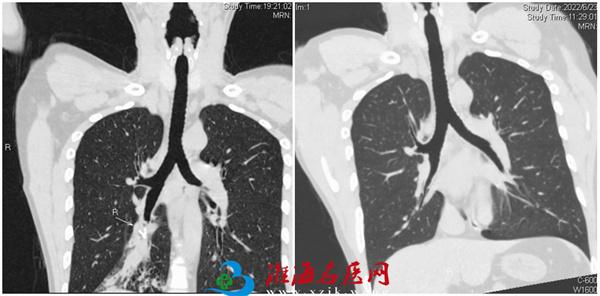 患者醒后回忆可能几年前甚至孩童时期不慎误吸该金属物,他不忘给医护人员点赞:“徐医附院水平没说的,太感谢了!”呼吸内镜治疗后第二天复查CT,异物取出后右肺下叶气管远端狭窄明显改善。
