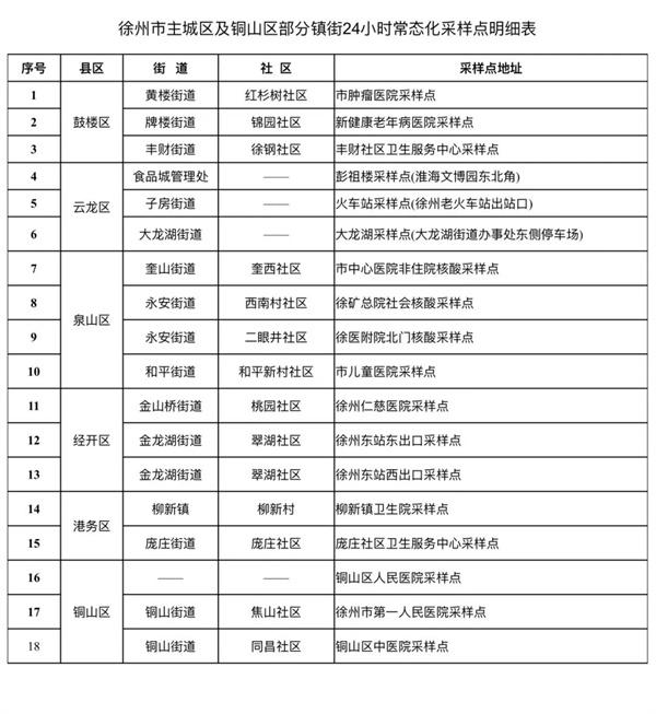 继续开展区域核酸检测。按照国家防控方案规定,经专家组综合研判,决定7月4日继续在鼓楼区、云龙区、泉山区、徐州经济技术开发区、徐州淮海国际港务区,铜山区铜山街道、新区街道、棠张镇、房村镇、张集镇、柳泉镇开展核酸检测,样本采集起止时间为16时至21时,具体安排按照属地通知进行。请广大居民积极配合,做到应检尽检。
