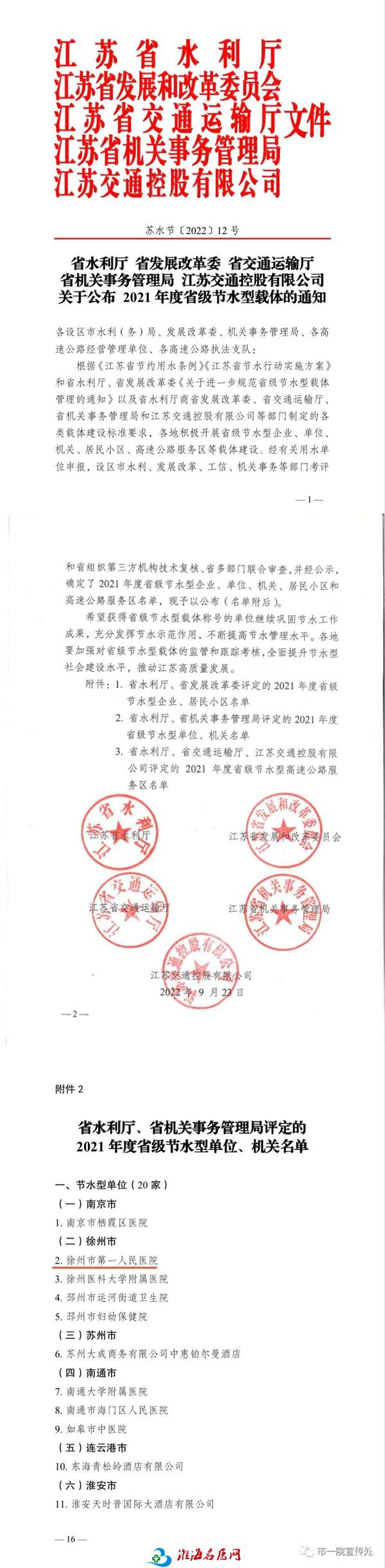 近日,江苏省水利厅、江苏省发展改革委、江苏省交通运输厅、江苏省机关事务管理局、江苏交通控股有限公司下发《关于公布2021年度省级节水型载体的通知》,市一院荣获“2021年度省级节水型单位”。按照江苏省严格的水资源管理考核和节约用水工作联席会议办公室关于年度实行严格水资源管理制度目标任务的要求,市一院总务处通过申报、地市初审、省级技术复核和省发改委、工信厅、住建厅、交通运输厅、机关事务管理局等联合审查,荣获此殊荣。