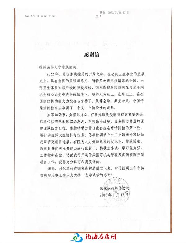 近日,徐州医科大学附属医院收到了来自国家疾控局传防司的感谢信,对徐州医科大学附属医院在疫情防控期间给予的大力支持和积极配合表示衷心的感谢和诚挚的敬意。