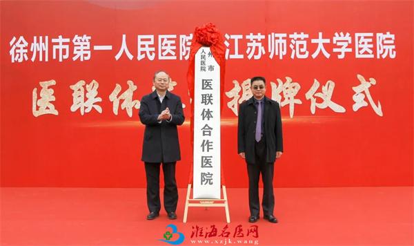 签约与揭牌仪式在江苏师范大学医院举行。徐州市第一人民医院党委书记、院长丁继存,江苏师范大学党委书记方忠,徐州市第一人民医院副院长吴小进,江苏师范大学副校长苗正科,徐州市第一人民医院党政办、合作发展处负责人及江苏师范大学党委办公室、后勤管理处、卫健办公室、医院负责人等出席仪式。