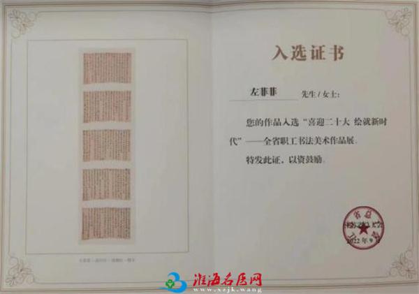 对待生活,虚怀若谷,平易近人,予同事帮助,予同学关心。同时左菲菲还有一个特殊身份:徐州市书法协会会员、徐州市青年书法家协会会员、徐州市艺术家协会会员等,其作品《菜根谭》在2022年9月江苏省科学技术协会举办主题书画摄影艺术展活动中荣获“书法组三等奖”。《道德经》在2022年8月入展江苏省总工会举办的全省职工书画展。“挫其锐,解其纷;和其光,同其尘”,左菲菲正是用这种精神,感染着身边的每一个人。