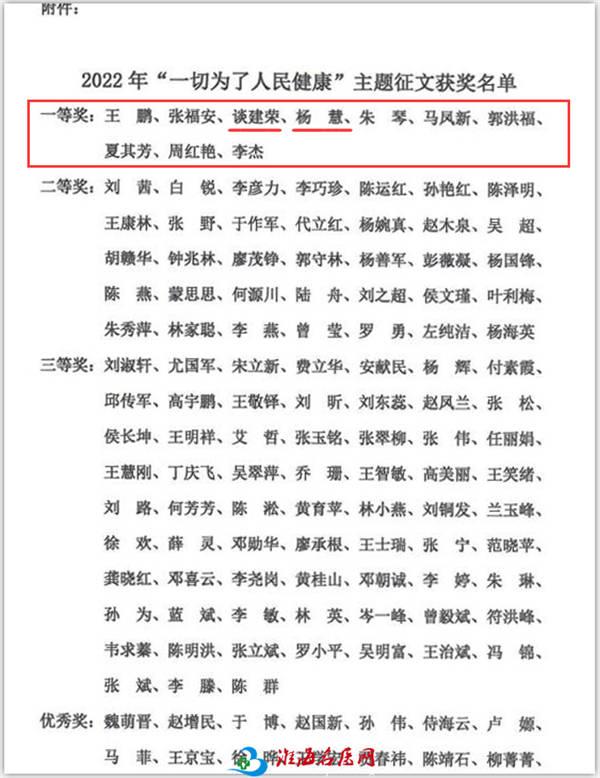 去年7月,为迎接党的二十大胜利召开,全面推进健康中国建设,国家卫生健康委员会《人口与健康》杂志社与各省卫生健康委宣传处联合开展了“一切为了人民健康”主题征文活动,经有关专家严格评审,全国共评选出一等奖10篇,二等奖30篇,三等奖50篇,优秀奖125篇。我市共获得一等奖2篇(市卫健委1篇、徐州市东方人民医院1篇)、三等奖1篇、优秀奖3篇。