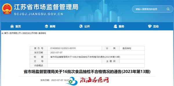 近期,江苏省市场监督管理局组织食品安全抽检,抽取食用农产品、肉制品、水果制品、豆制品、炒货食品及坚果制品、罐头、蜂产品、乳制品、冷冻饮品、食品添加剂、糕点、调味品、粮食加工品、蔬菜制品、速冻食品、饮料和餐饮食品等17大类食品838批次样品,检出其中炒货食品及坚果制品、餐饮食品、糕点、食用农产品和饮料等5大类食品16批次样品不合格。具体情况通告如下: