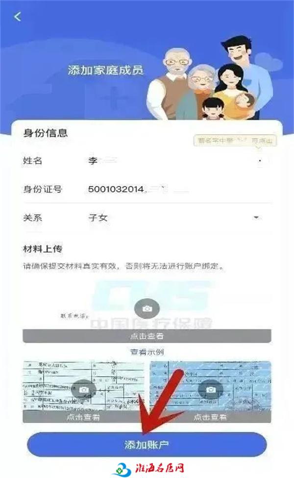 进入“添加家庭成员”界面,填写儿童的“姓名”、“身份证号”并选择“关系”,选择“点击上传个人承诺书”、上传户口本(或身份证)。