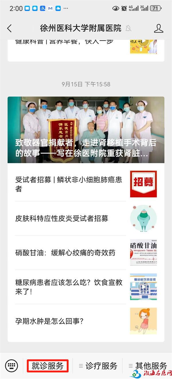 2、微信搜索“江苏健康通”⇒完成注册和实名认证⇒互联网医疗⇒医疗服务⇒选择线上复诊或在线咨询⇒选择“徐州医科大学附属医院”⇒选择科室、医生⇒选择图文咨询⇒ 填写病情⇒完成提交⇒等候接诊⇒医生接诊后微信有服务通知⇒点击即可看诊。