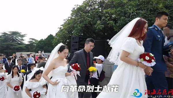 巍巍淮塔,庄严肃穆。新郎新娘手捧鲜花,齐声唱起《中华人民共和国国歌》,国歌唱毕,向烈士默哀、敬献鲜花。他们心里感受到浓烈的家国情怀和中国青年的使命担当。
