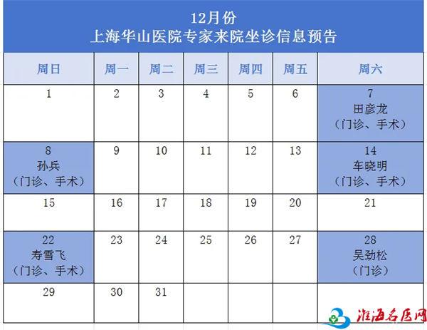 12月份,上海华山医院神经外科车晓明、吴劲松、田彦龙、寿雪飞、孙兵教授将坐诊徐州市中心医院“上海华山医院-徐州市中心医院联合门诊”,专家号源陆续发放,具体信息如下: