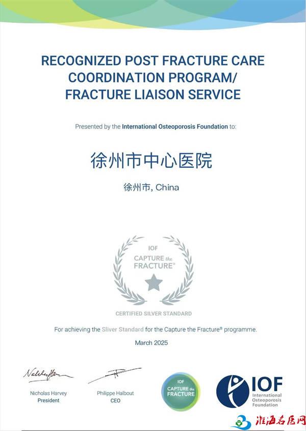 近日,经过严格评选,徐州市中心医院核医学科骨折联络服务鹿存芝团队申请的骨折联络服务(Fracture Liaison Service, FLS)获得国际骨质疏松基金会(IOF)认证银牌奖。
