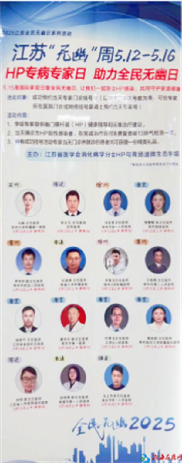 近日,由徐州市消化疾病研究所、徐州一院开展的2025年江苏基层幽门螺杆菌防治公益活动,在徐州一院消化内科门诊和内镜中心同步开启。本期主题为“科普同襄行·智启健康路——自我管理·守护健康”,旨在提升公众对幽门螺杆菌感染的认知水平和防治能力。