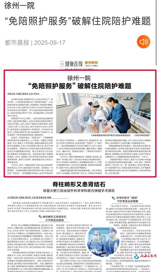 “免陪照护服务”将医疗、服务与生活照护有机融合,受到诸多患者和家属的青睐。未来,徐州一院将持续深化“医护患三位一体”服务模式,优化护理内涵,扩大免陪照护试点,构建全流程关怀体系,让护理服务既有精度更有温度,既专业又充满情怀,打造有辨识度的人文护理品牌。