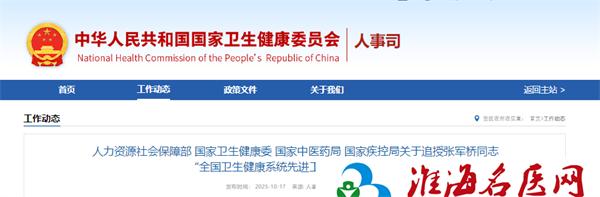 张军桥同志被追授“全国卫生健康系统先进工作者”称号