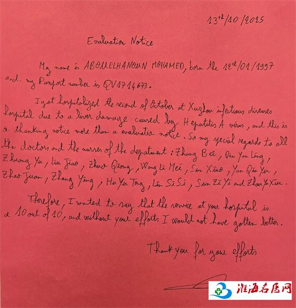 近日,北京地坛医院徐州医院(徐州七院)综合内科收到一封来自摩洛哥小伙儿的手写感谢信。