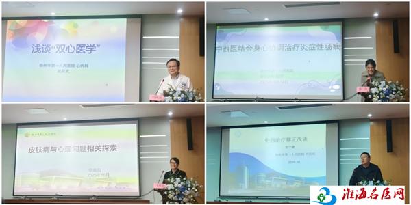 徐州一院党委副书记刘峰教授,南京中医药大学徐征教授、杨涛教授,徐州市中医院史江峰教授,徐州一院王劲松、孙慧丽、刘辉、周昊、赵跃武、姚萍、李海英、常宁遒等教授,结合各自领域,聚焦中西医融合与临床实践,分别以《新象数理论构建与临床》《郁证的藏象辨证论治》《人工智能赋能中医诊疗康养的实践与思考》《六经分治郁病理论与临床应用》《早泄伴郁证论治简说》《心系统藏象辨证在以失眠为主症的心身疾病中的临床应用》《身心同调–打破失眠困局》《睡眠障碍对脑卒中的影响》《浅谈“双心医学”》《中西医结合身心协调治疗炎症性肠病》《皮肤病与心理问题相关探索》《中药治疗郁证浅谈》为题进行专题授课。