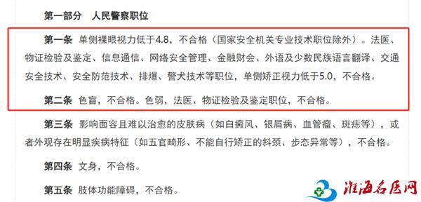 人民警察职位:单侧裸眼视力低于4.8,不合格(国家安全机关专业技术职位除外)。