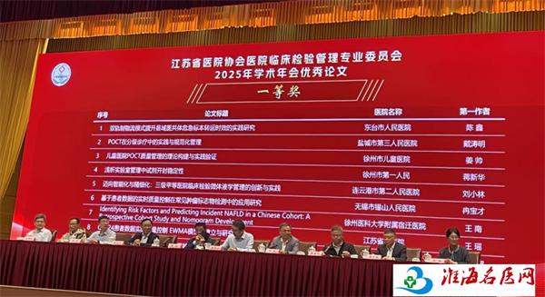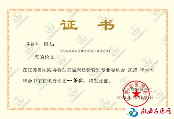 从江苏省医院协会临床检验管理专业委员会2025年学术会议获悉,徐州市第一人民医院医学检验科主任技师蒋新华在科主任、学科带头人王丽教授的悉心指导与带领下,《浅析实验室管理中试剂开封稳定性》荣获优秀论文一等奖。此次获奖,是医学检验科在江苏省临床检验管理方面突出的有力见证,同时也标志着专科建设和学术水平得到了省内同行的充分认可,更是徐州一院医学检验科高质量发展的最佳诠释。