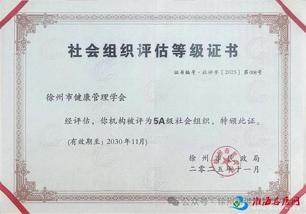徐州市民政局公布了,2025年度徐州市社会组织评估等级,徐州市健康管理学会获评5A级别,特此喜报!