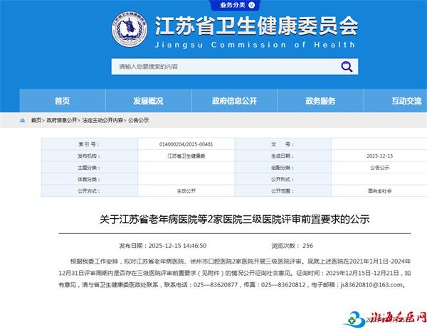 根据我委工作安排,拟对江苏省老年病医院、徐州市口腔医院2家医院开展三级医院评审。现就上述医院在2021年1月1日-2024年12月31日评审周期内是否存在三级医院评审前置要求(见附件)的情况公开征询社会意见。征询时间:2025年12月15日-12月21日,如有意见,请与省卫生健康委医政处联系,联系电话:025—83620877,传真:025—83620812,电子邮箱:js83620810@163.com。