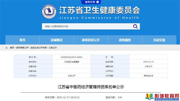 根据工作安排,我局组织开展了中医药经济管理师资库遴选工作。经各相关单位推荐、组织遴选等程序,现将江苏省中医药经济管理师资库拟入选名单予以公示(名单附后),公示时间为5个工作日(2025年12月17日-12月24日)。