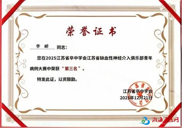 [摘要]:徐州健康:日前,在江苏省卒中学会举办的“江苏省缺血性神经介入青年病例大赛”上,我院神经内科主治医师李峤以参赛病例《无“路”可走的取栓患者》,获得决赛第三名。本次大赛是江苏省缺血