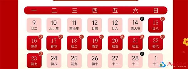 根据国家2026年春节放假安排,2026年2月15日(周日)至2月23日(周一)为春节假期(共9天)。