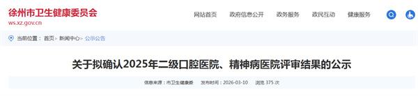 徐州市卫生健康委员会发布拟确认2025年二级口腔医院、精神病医院评审结果公示