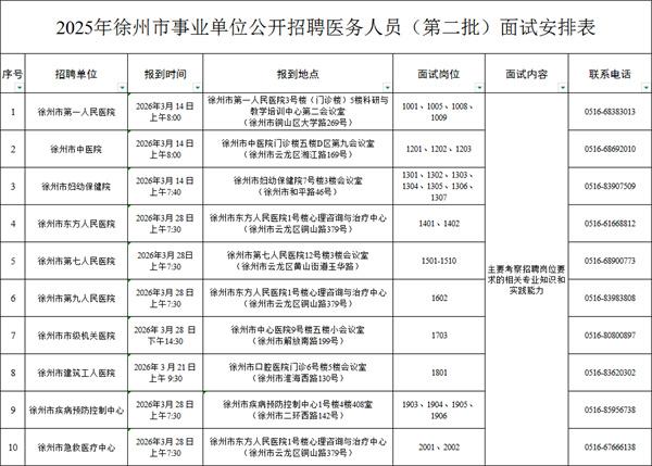 根据《2025年徐州市事业单位公开招聘医务人员(第二批)公告》要求,现将徐州市事业单位公开招聘医务人员(第二批)面试有关事项通知如下: