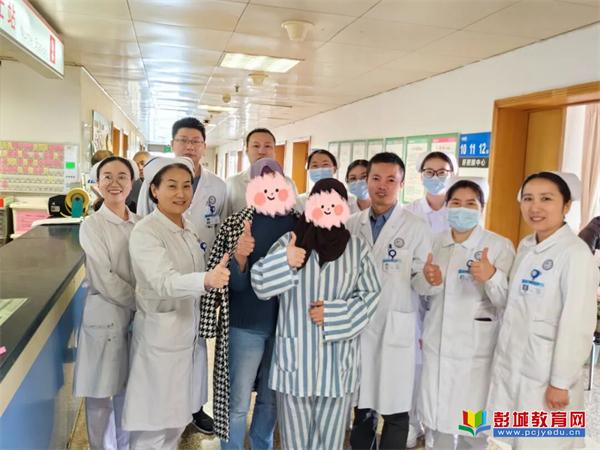 出院前,患者及家属向医护团队竖起大拇指