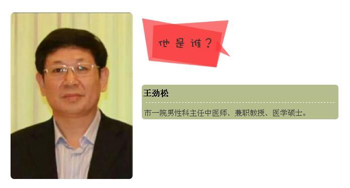 王劲松,市一院男性科主任中医师、兼职教授、医学硕士。先后毕业于安徽中医药大学、南京中医药大学。现任世界中医药联合会男科分会常务委员、国际中医男科学会副主席、中华中医药学会男科分会委员、中华中医药学会科普分会常务委员、江苏省中医药学会男科分会副主任委员、徐州市医学会男科分会副主任委员、徐州市中西医结合学会男科分会副主任委员。国内外首次提出许多男性科理论、临床论治学说,对男子不育症、性功能障碍、慢性前列腺炎、精囊炎与性病等男性科、内科疑难杂症积累了丰富的理论与临床经验。被评选为“全国首届百名优秀中医药科普专家”、“全国百名优秀中医药健康信使”,并荣获“全国中医药科普金话筒奖”及省、市科学技术进步奖等。主编、参编医学专著11部,于国内外医药刊物上发表医药论文112篇、医药科普文章300余篇、参与省级课题研究六项。