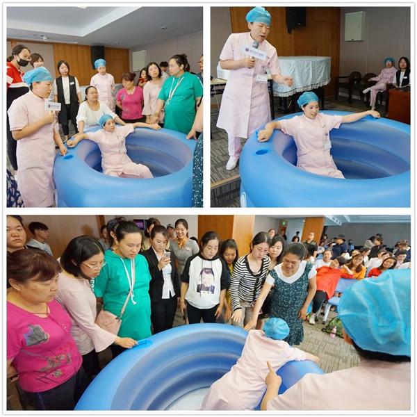 ▲导乐师、助产士向孕妈展示水中分娩池如何使用